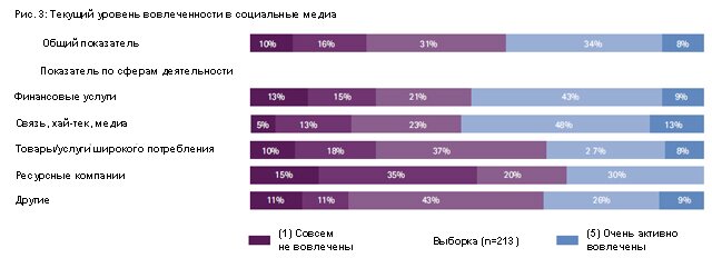 По данным нашего исследования (первую часть исследования читайте тут), лишь 8% В2В-компаний проявляют существенную активность в социальных медиа, а более 25% либо совсем не работают в соцмедиа, либо работают очень незначительно (см. рис. 3).