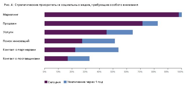 Респондентов попросили сравнить их текущий уровень активности в социальных медиа с ожидаемой приоритетной активностью через один год. Опрашиваемые высказали намерение повысить активности в соцмедиа в контексте продаж, обслуживания, контакта с партнерами и поставщиками. Использование социальных медиа как инструментов для поиска инноваций отмечено в качестве наиболее приоритетного мотива, а работа в социальных медиа для маркетинговых кампаний требует, по мнению опрашиваемых, меньше всего внимания. По большому счету, участники опроса «Accenture» удовлетворены уровнем активности в социальных медиа в этой области и отмечают, что маркетинговые задачи в настоящее время и в годичной перспективе будут решаться «по мере появления необходимости».