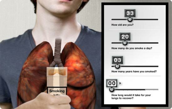 - Расположенное в США рекламное агентство SapientNitro запустило в июле 2011 года приложение с дополненной реальностью, которое называется Lungs, чтобы показать курильщикам вред, наносимый сигаретами. Пользователи могут регулировать настройки, отражая собственный опыт, основанный на таких факторах, как возраст и количество выкуриваемых сигарет в день; все это влияет как на зрительное представление, так и на «время, необходимое для восстановления легких».