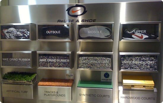 - Новаторская схема компании Nike Reuse-A-Shoe scheme (впервые запущенная еще в дААлекие 90-е!) собрала и переработала на сегодняшний день более 25 миллионов пар изношенной обуви Nike. Старые кроссовки разрезают, разъединяют и перемалывают в материал, который называется Nike Grind, из которого потом делают покрытия для спортивных залов и площадок, а также разнообразную продукцию Nike.