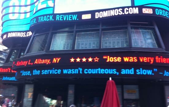 - В июле 2011 года американский продавец фаст-фуда Domino’s запустил в Нью-Йорке месячную рекламную кампанию. Арендовав огромный рекламный щит на Таймс-Сквер, бренд транслировал на цифровом экране (хорошие и плохие) отзывы клиентов, оставляемые в Twitter.