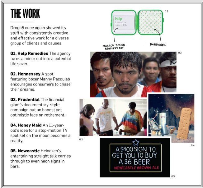 Закаленный в бою креатив Droga5, Агентства Года в США по версии Adweek, в 2012 то и дело появлялся на всеобщем обозрении. Их выручка в США выросла на 43%, составив 41 млн. долл., благодаря сотрудничеству с брендами, вроде American Express Travel. Свою репутацию агентство подкрепляло добрыми делами, в частности, сбором более 1 млн. долл. на обеспечение нуждающихся детей чистой водой на шестом году своей работы над проектом Tap Project для UNICEF, а также получением награды Cannes Grand Prix for Good за кампанию о донорстве костного мозга для Help Remedies.